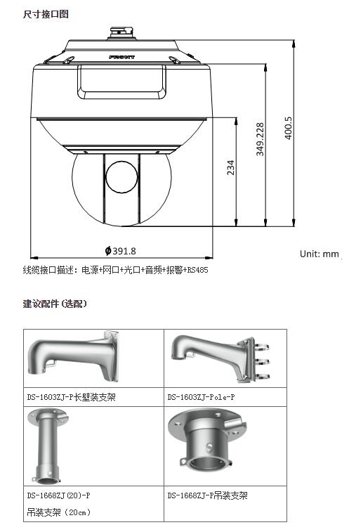 iDS-2DP0818ZIX-D/253(5mm)星光級全景網絡高清智能球機,采用一體化設計,單產品即可同時提供全景與特寫畫面,兼顧全景與細節。其中全景畫面由4個傳感器拼接而成,可實現180度的全景監控;一體化機芯和高速云臺設計,在全景監控的同時為用戶提供快速細節定位功能。另外鷹眼系列全景球機還集成了先進的視頻分析算法和多目標跟蹤算法程序,可實現自動或手動對全景區域內的多個目標進行區域入侵、越界、進入區域、離開區域行為的檢測,并可輸出報警信號和聯動云臺跟蹤,從而滿足高等級要求的安保需求。